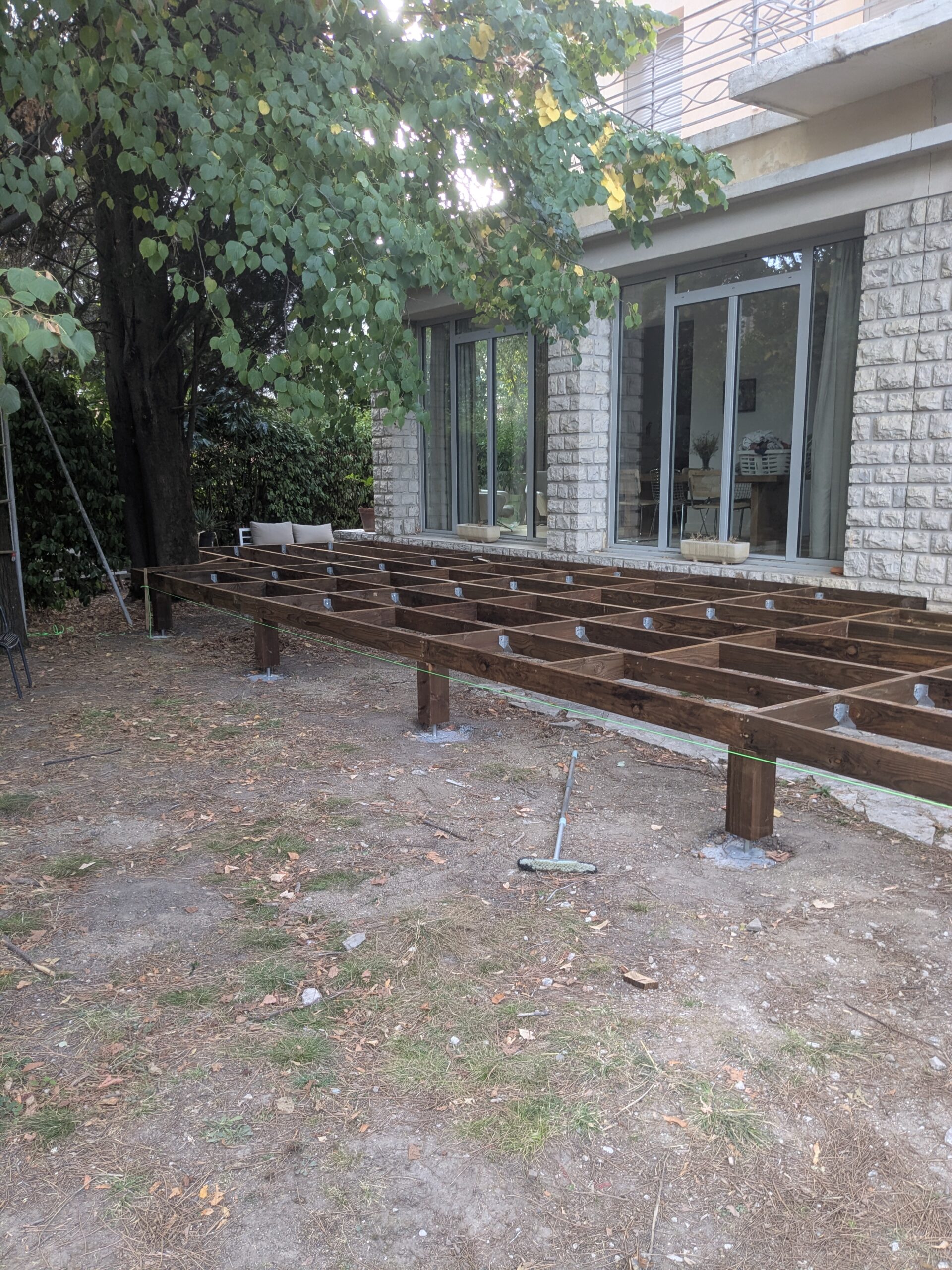 Fabrication d’un châssis fixe en ossature bois (45*145 et 80*220) posé sur plots béton et scellé au mur.